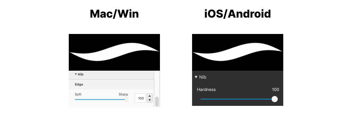 When you want to clean up line work or carve-back color layers, you typically want an eraser that will clear paint in a single stroke with a hard edge (little or no feathering). The key settings that make a hard eraser are Opacity and Hardness. You will also want to avoid custom Nib Shapes and Nib Textures as these can affect the opacity of the eraser.