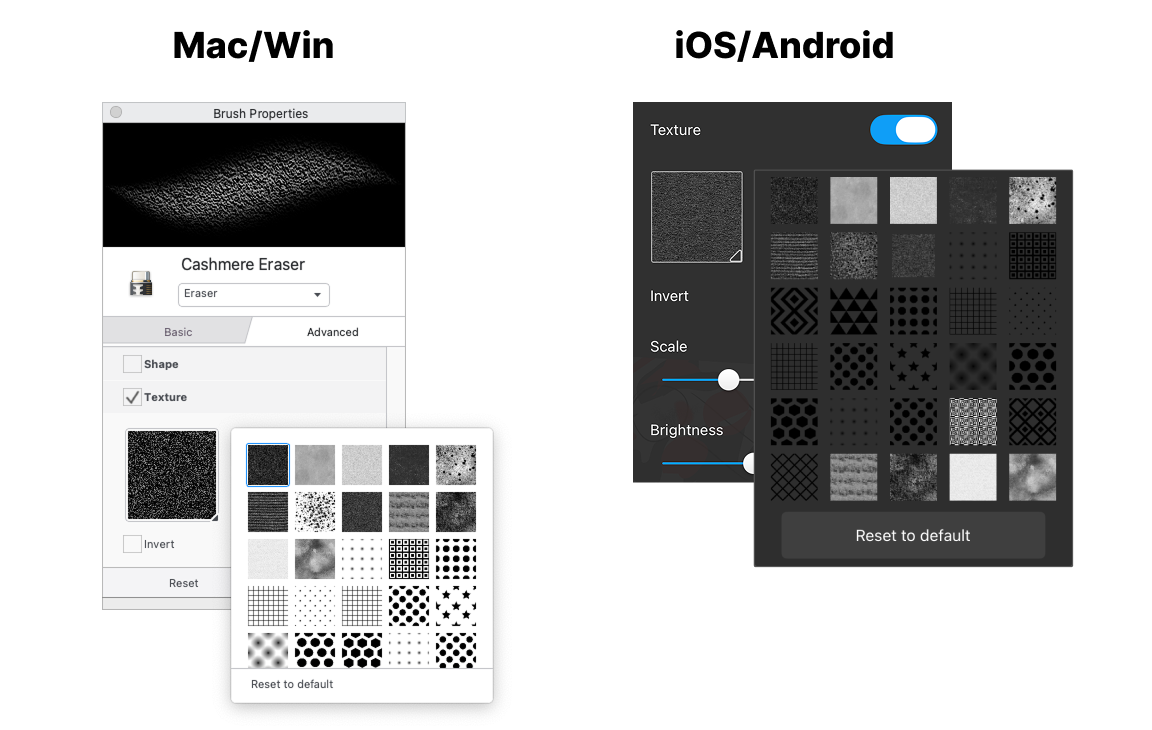 Nib Texture applies a mask to the eraser. The texture automatically repeats and can be used to create paper textures, grains, or patterns to the eraser.