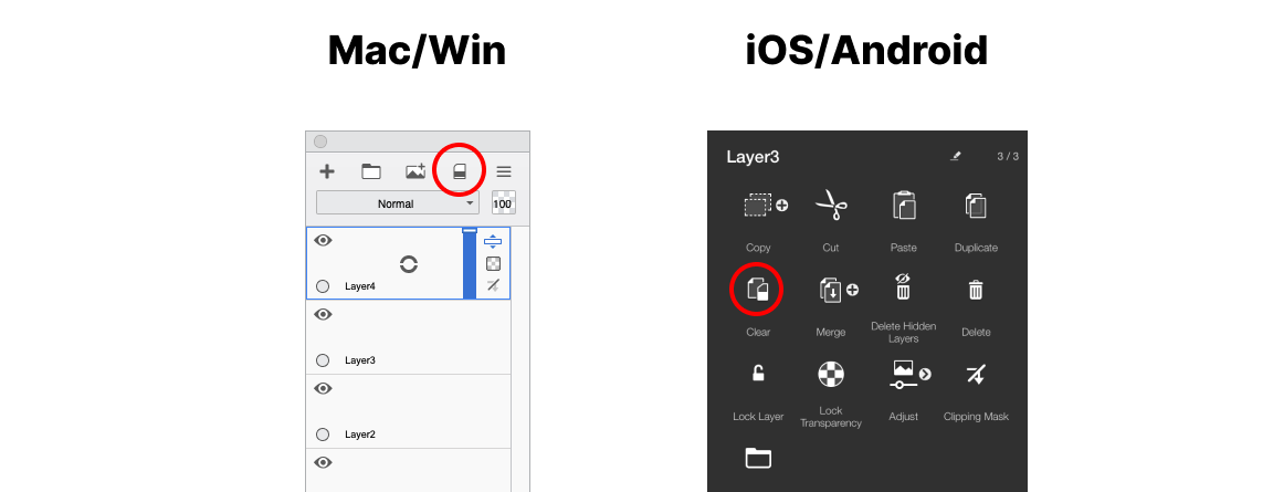 On Mac and Windows, Clear is located in the header of the Layer Editor, the Edit Menu, and mapped to the delete key.