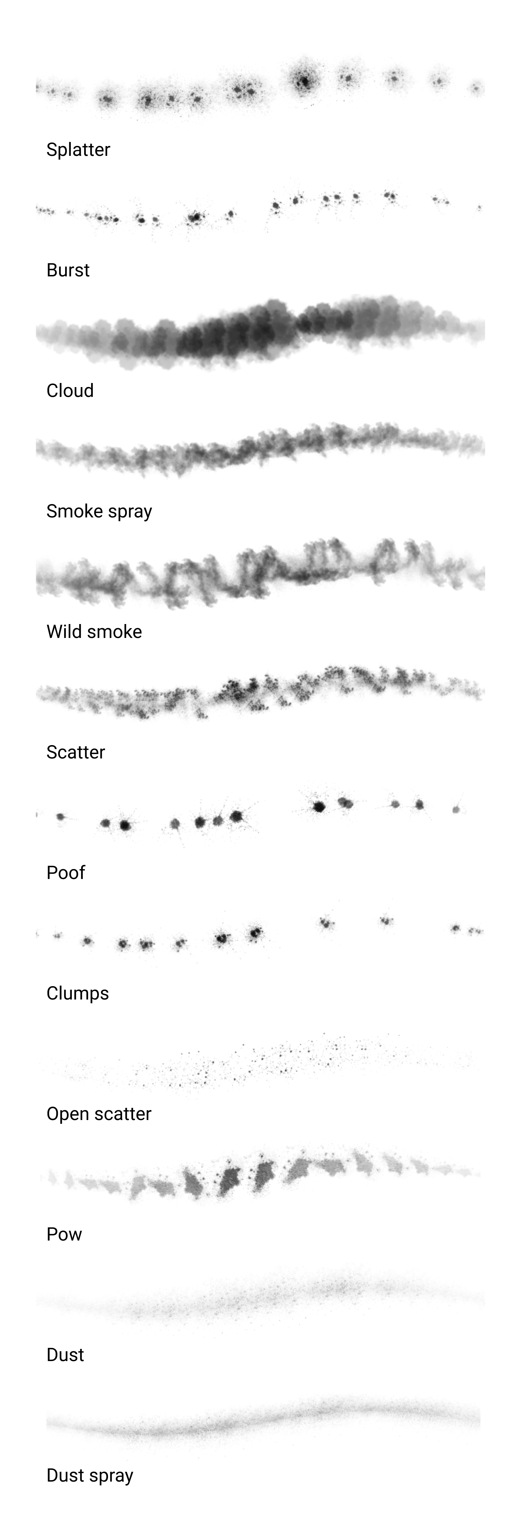 12 stamps of particle splatters, sprays, and clouds