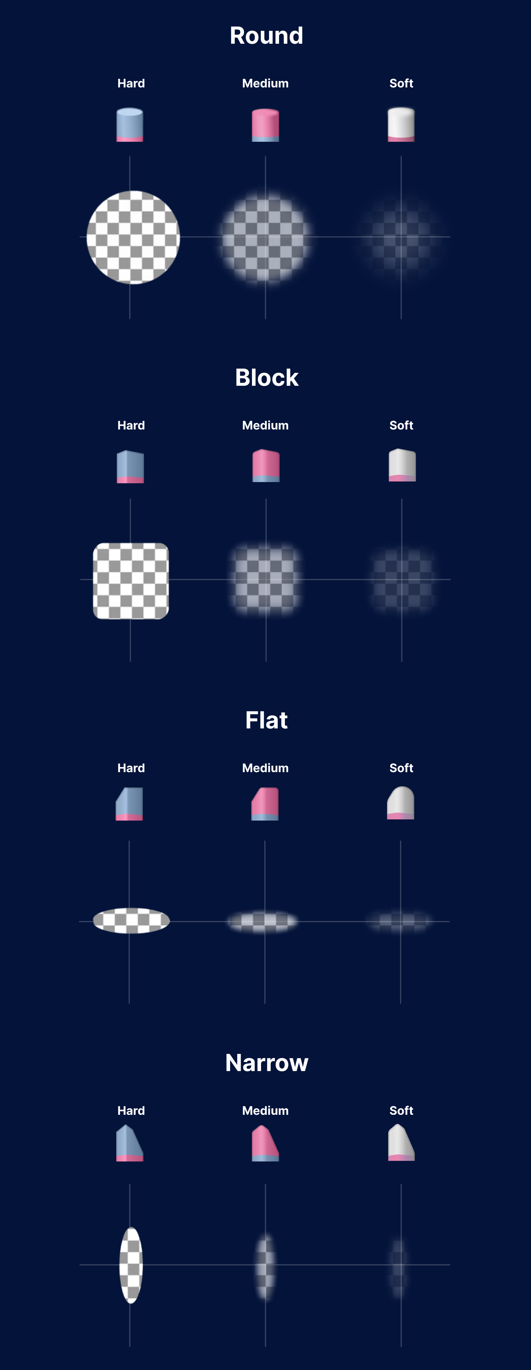 The icons are inspired by the colors of classic 2-in-one erasers to help distinguish them from other brush types.